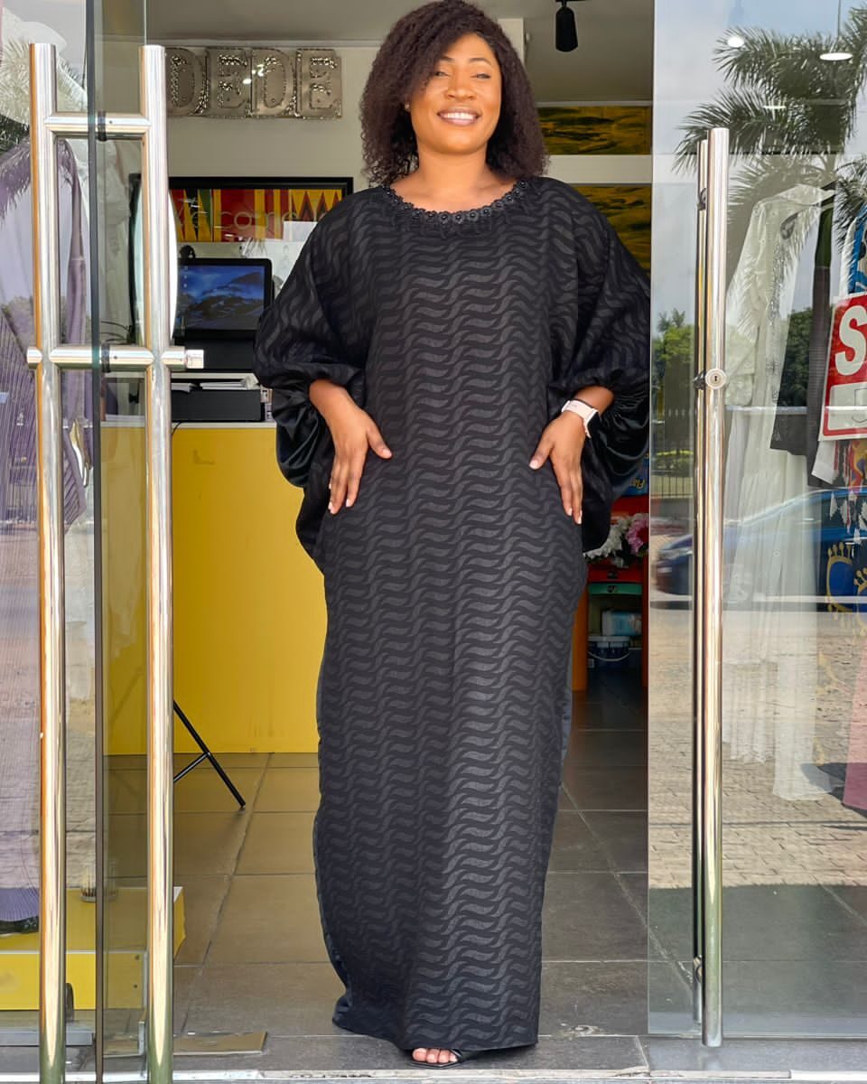 This flowing black boubou features a subtle textured pattern with intricate beaded neckline details, offering both sophistication and comfort. Perfect for formal events or casual outings, it blends tradition with modern elegance.