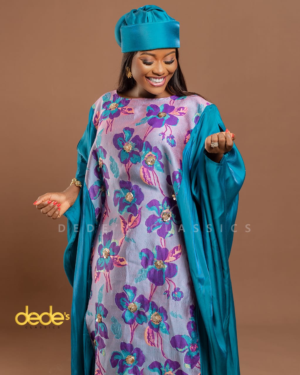 A stunning floral boubou featuring a soft lilac base adorned with vibrant purple and turquoise floral embroidery. The luxurious fabric is complemented by a flowing teal outer robe, adding a touch of sophistication. Paired with a matching satin headpiece, this ensemble is perfect for formal gatherings, celebrations, and cultural events.