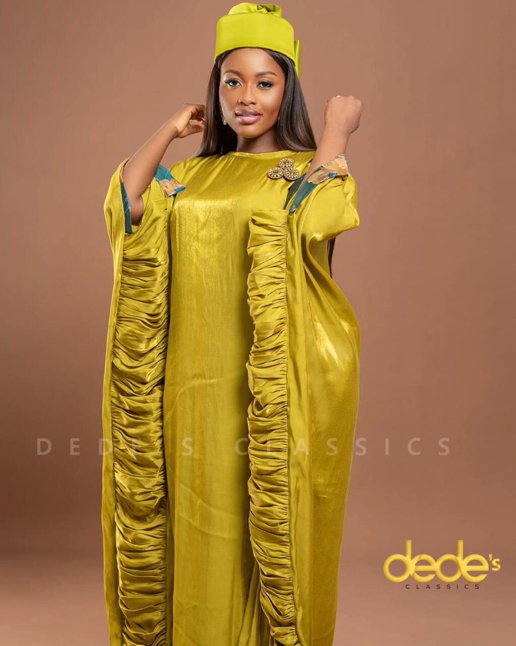 This stunning luxury boubou is crafted from premium satin fabric with ruched detailing along the sides, adding a touch of sophistication and grandeur. The outfit is complemented by a matching headpiece, making it perfect for high-profile events, traditional ceremonies, or elegant gatherings. The intricate floral embellishments on the shoulders enhance its regal appeal.