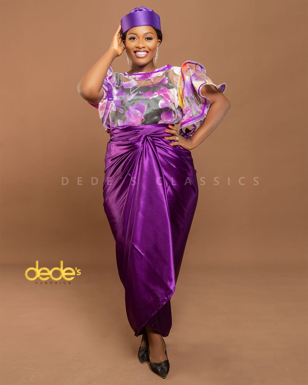 A sophisticated satin wrap dress with a matching headpiece, blending traditional and modern styles. Ideal for weddings, church, and special events.